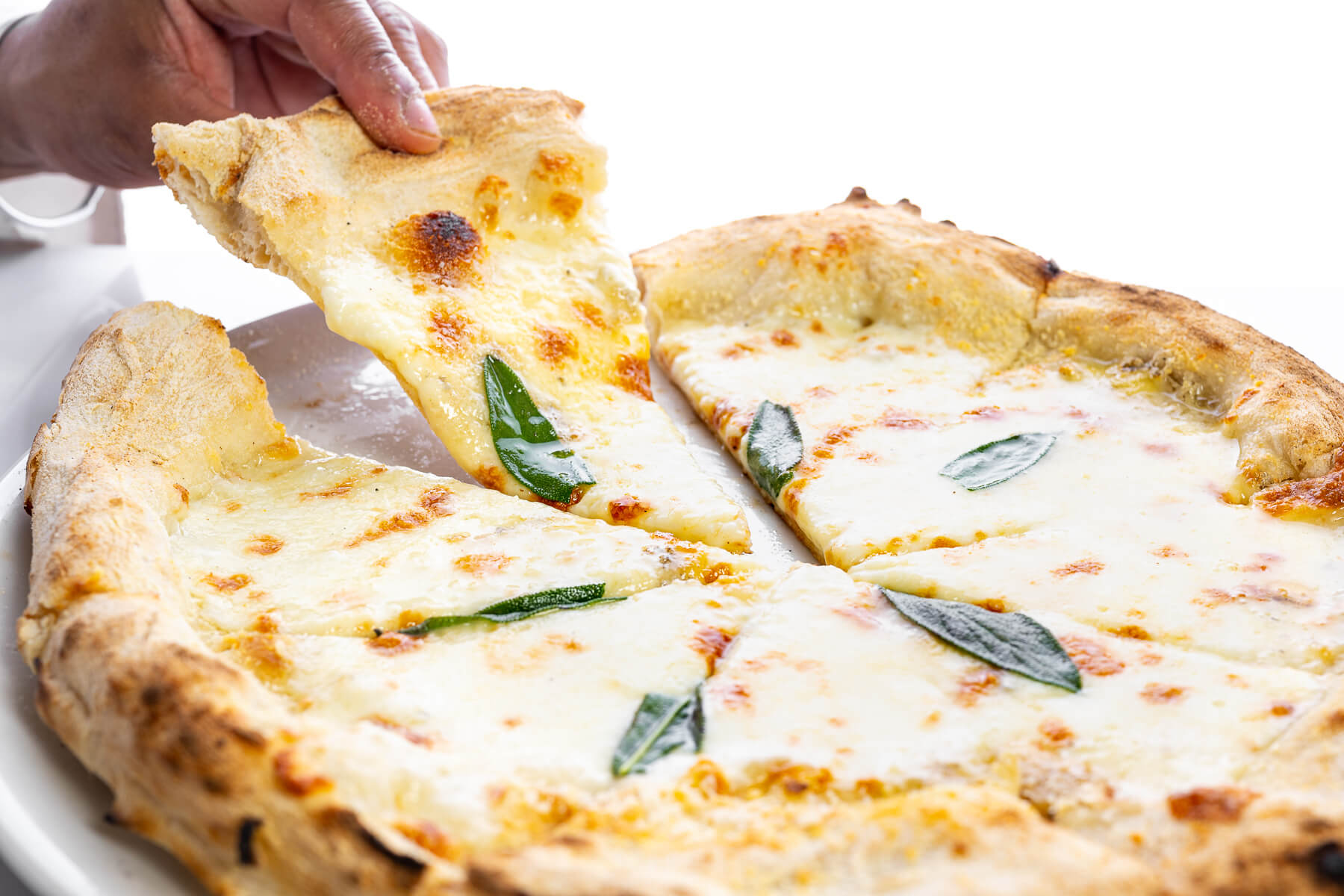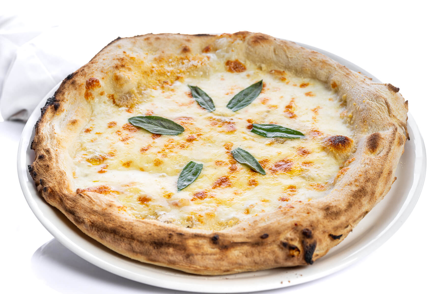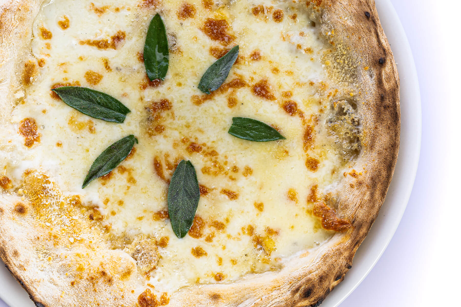 Cuatro quesos y un toque mágico. Base blanca (sin tomate), queso Gorgonzola, queso Taleggio, queso mozzarella Fior Di Latte, queso di Parma y unas hojitas de salvia que realzan los sabores de los quesos.